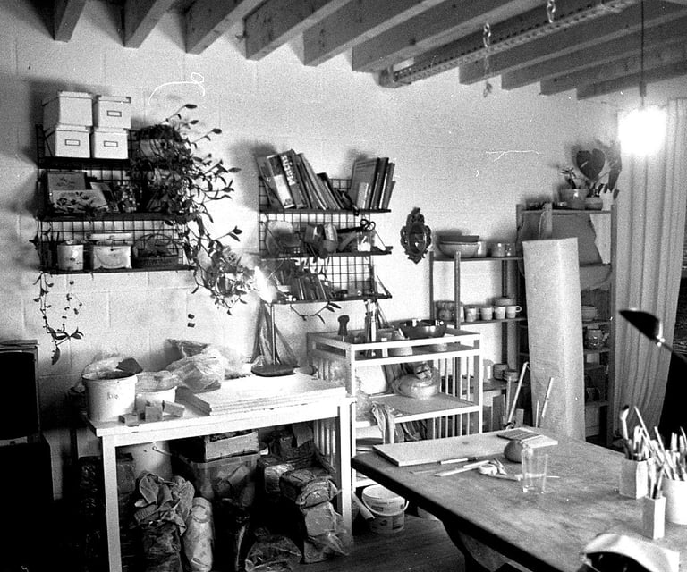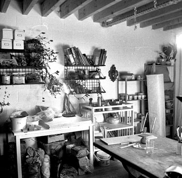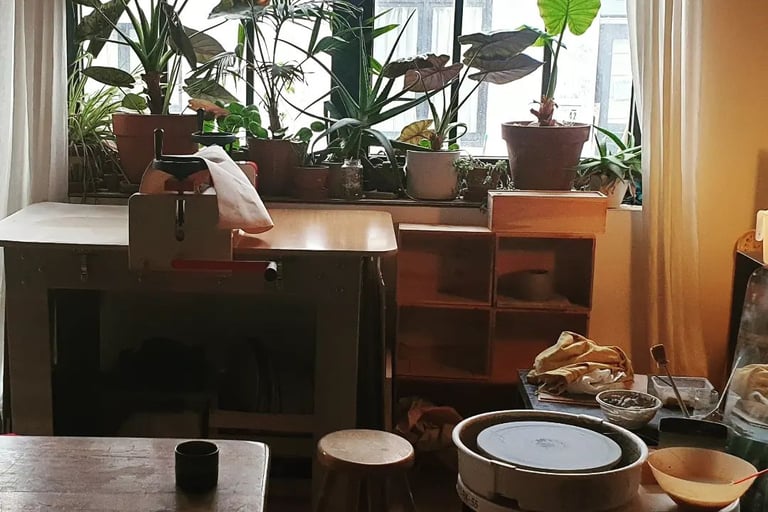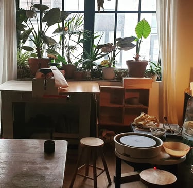 Aline Michel a installé son atelier à Namur. Son atelier est son antre, où elle laisse libre cours à sa passion mais aussi un lieu de rencontre autour de la terre lors des cours qui s'y déroulent et un lieu de vie, où passent les amis pour travailler à ses côtés ou juste venir passer une moment.